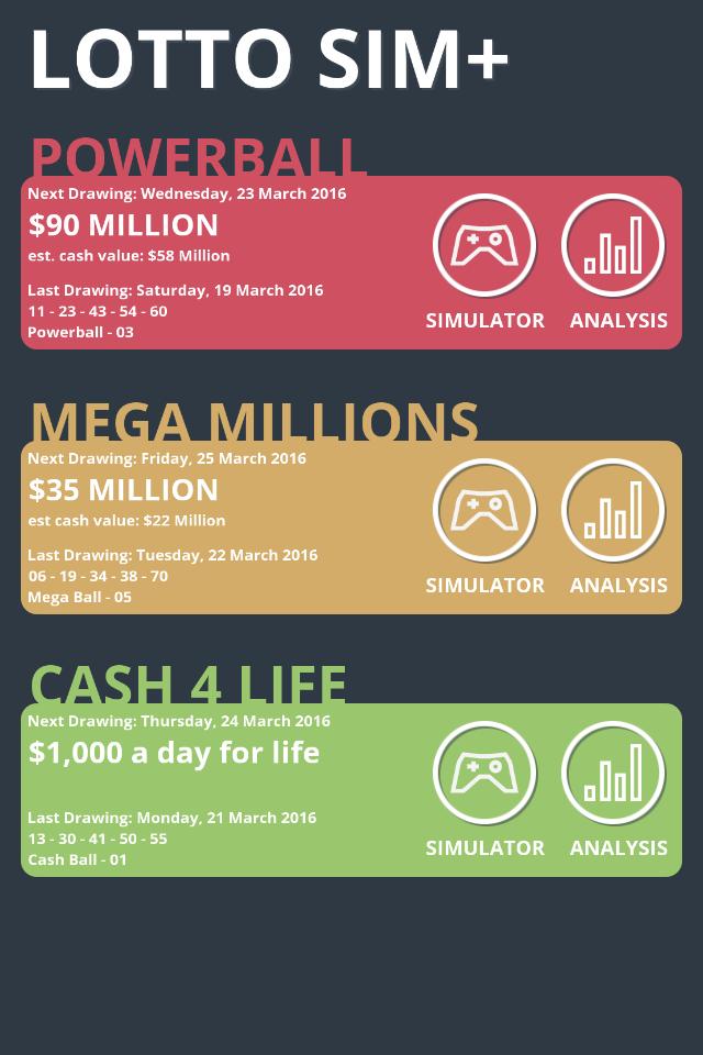 Lotto Sim+ is a simulator for Powerball, Mega Millions, and Cash 4 Life lottery games. Check the latest lottery results and current jackpots. Single screen analysis of each game visualizes how often and recently numbers have been drawn.