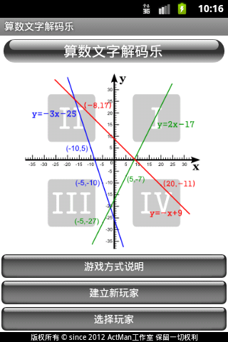 The "a" coefficient in linear equation "y=ax+b" is 1 or -1 when game level is "Easy"; is between 9 and -9 (except 0) when game level is "Normal". The "b" coefficient in linear equation "y=ax+b" is between positive and negative of characters count of the language minus 1. For example, in alphabet, "b" is between -28 and 28 (and might be 0); in bopomofo(注音), "b" is between -40 and 40(also might be 0). In game level "Hard", the rule of linear equation "y=ax+b" is the same as level "Normal", but won't show you the "a" and "b" coefficients, just show you "y=ax+b" text. Player have to solve for "a" and "b" with the given "question-answer" character pair, by "linear equations in two variables" solution, get a possible linear equation then substitute value into x or y then solve for y or x.