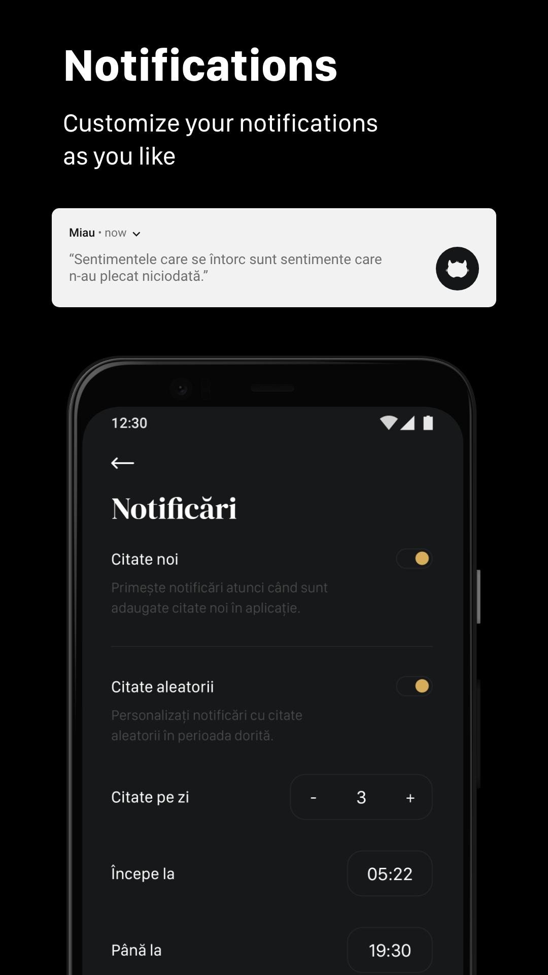 Last but not least, the application gives you the ability to turn the notifications on whenever you want to read the chosen citation of yours. Let the app motivate you any time of the day!