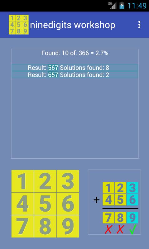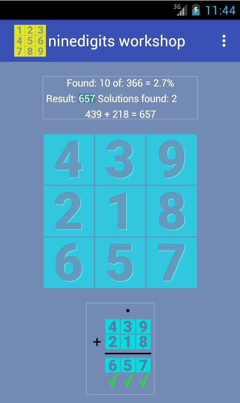 Ninedigits has 336 solutions. If the program would be easy for someone, then the goal could be to find valid solutions in which a Queen (Lady) could travel chess boxes 1 to 9 making right moves to this tab. According to our analysis, there are 3 solutions of this type. You can also look under the same condition, but with the Tower (Rock) of chess. This combination of conditions has only one solution. The program clearly shows the production of these special results.