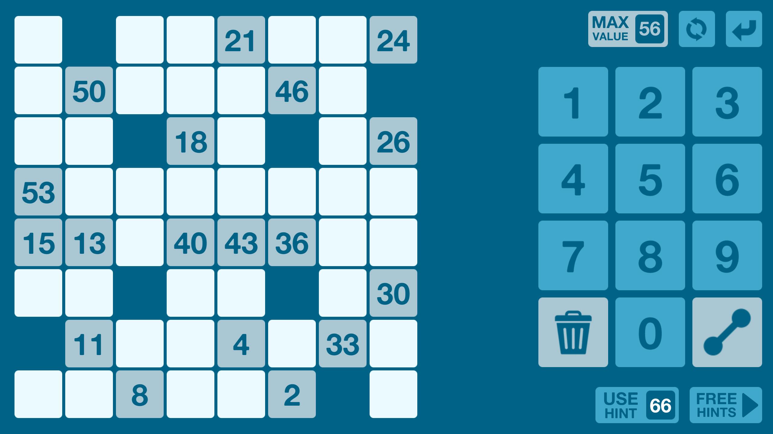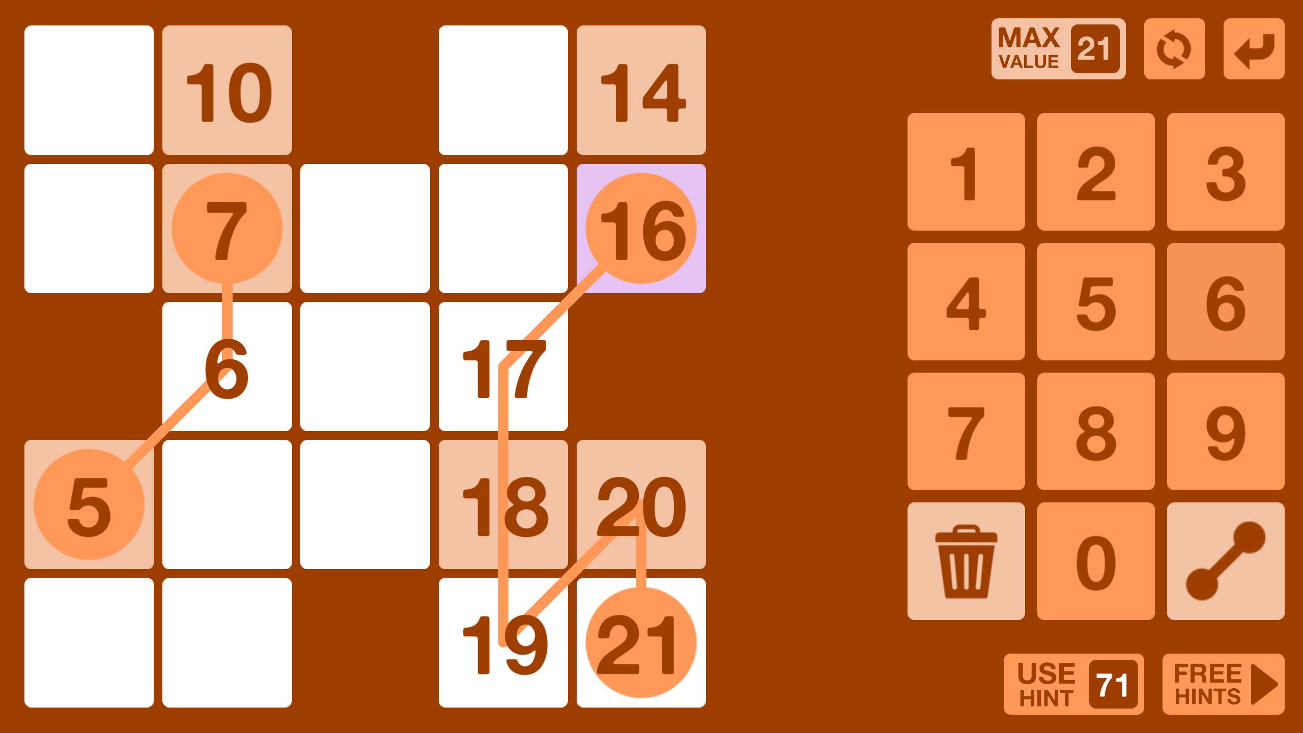 Each puzzle starts with just a few numbers filled in. You must fill in the rest to build an ascending sequence of connected numbers moving sideways or diagonally.