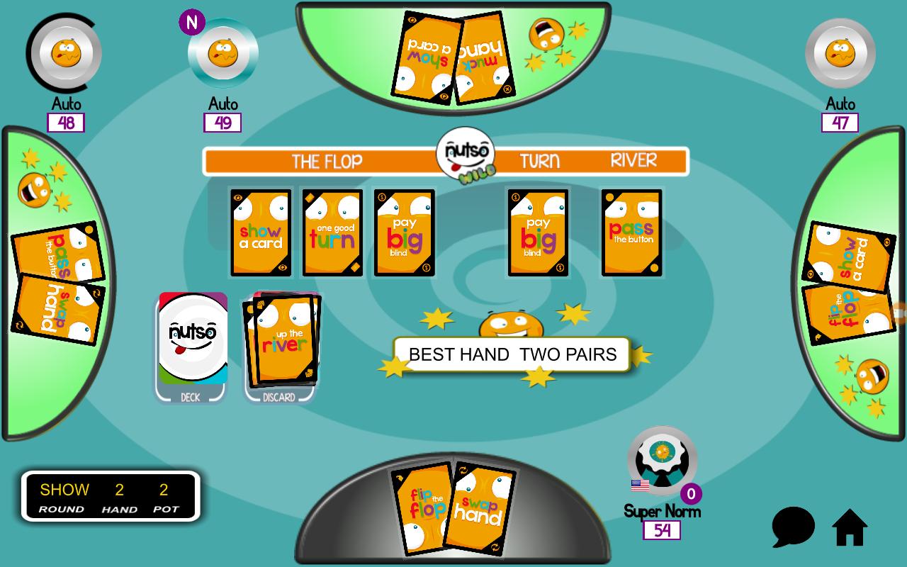 Play "Nutso Wild" based on the popular NUTSO card game. This poker-style game uses only the Nutso Wild cards to make the best 5 card hand. Every turn can immediately change who has the winning hand. Do you have the stomach for this unpredictable game? If you play Nutso, GO WILD!!!!