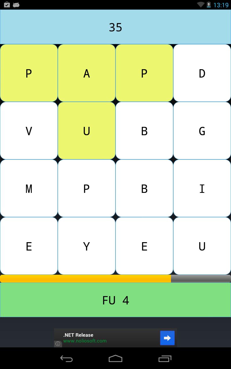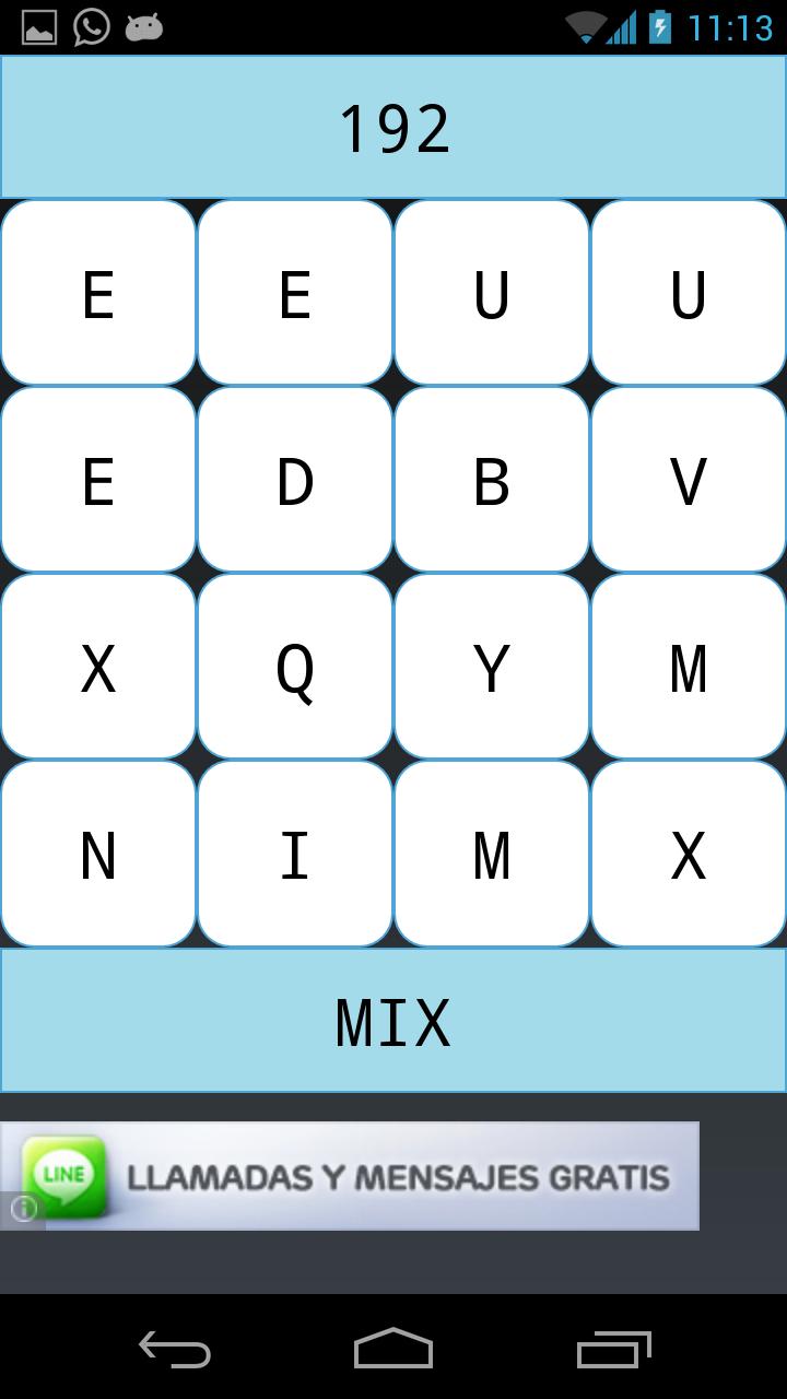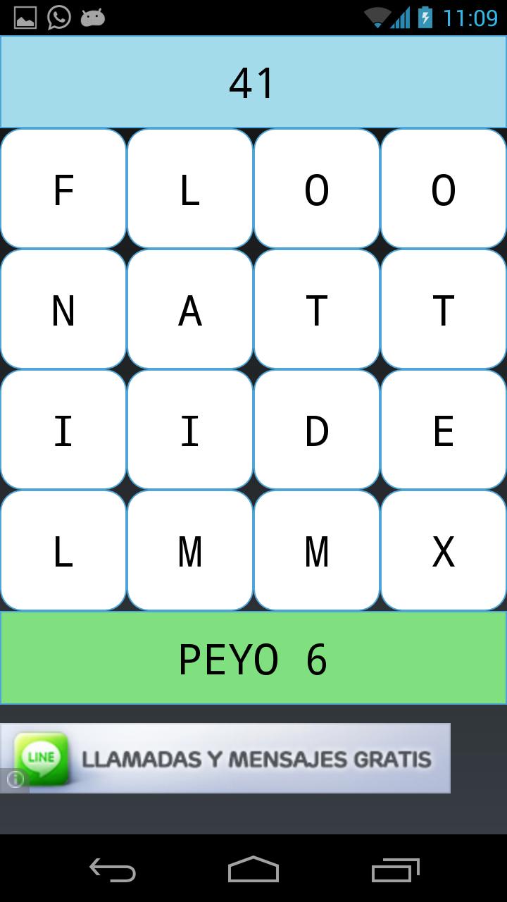 Waterfall where you must find words before time ends. Each word eliminates the letters that compose it and fall new letters. If you make words of 4 or more letters they give you extra points and time.