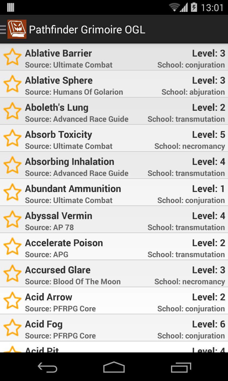 Pathfinder Grimoire OGL is a collection of all spells published for the game, grouped by classes, using the OGL license and the Compatibility license. You can filter and order them, or just mark as favorites. A very intuitive app for your favorite tabletop rpg.