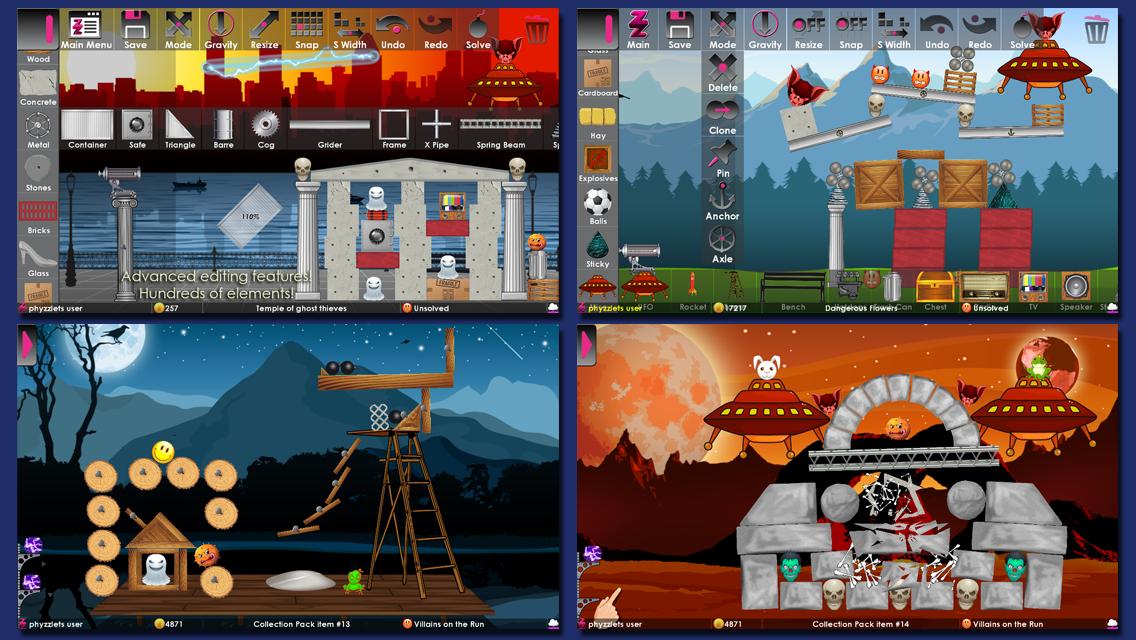 With ever growing selection of elements and powerful editing features, you can build various gravity-bound two dimensional structures in different scenes, select the objective, specify the means and let your friends figure it out.