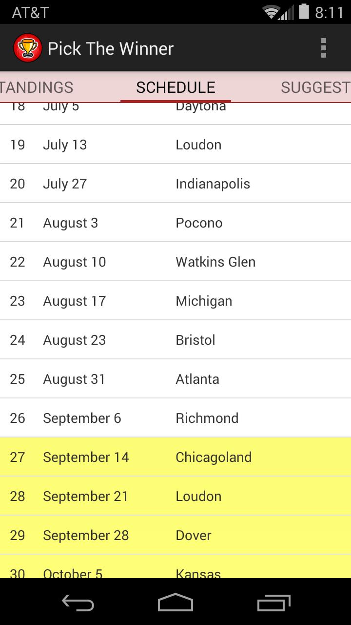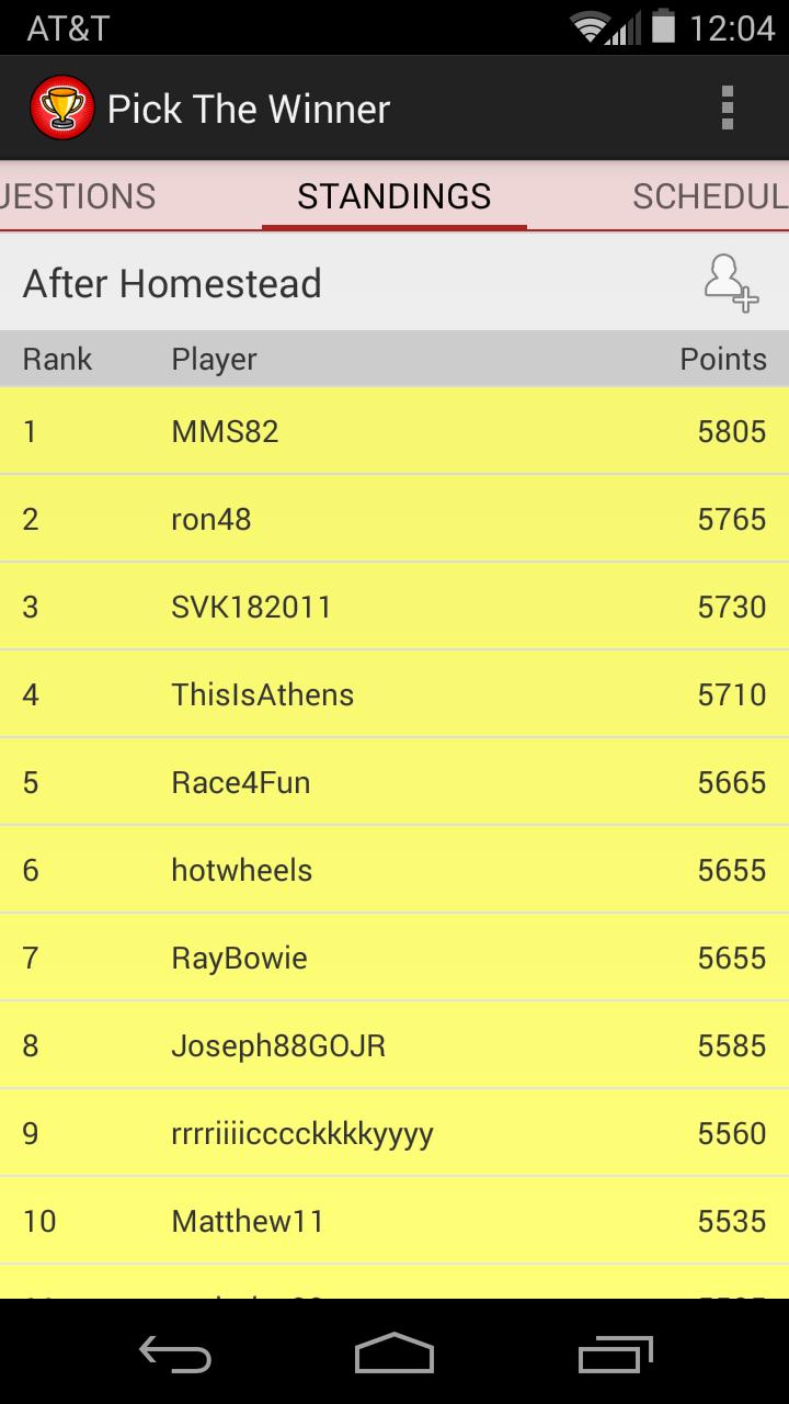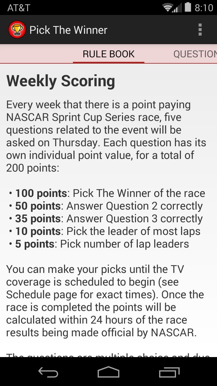 Pick The Winner is an Android game that allows NASCAR fans from around the world compete weekly for points which are earned by correctly answering questions about that week’s race. Players with the most points by the end of the regular season can participate in the Chase to determine the season champion. Your game history is saved on our server, so you can safely reset or change your Android device during a season and pick up right where you left off. Your Google identity remains private, with only a custom player name displayed if you so choose.