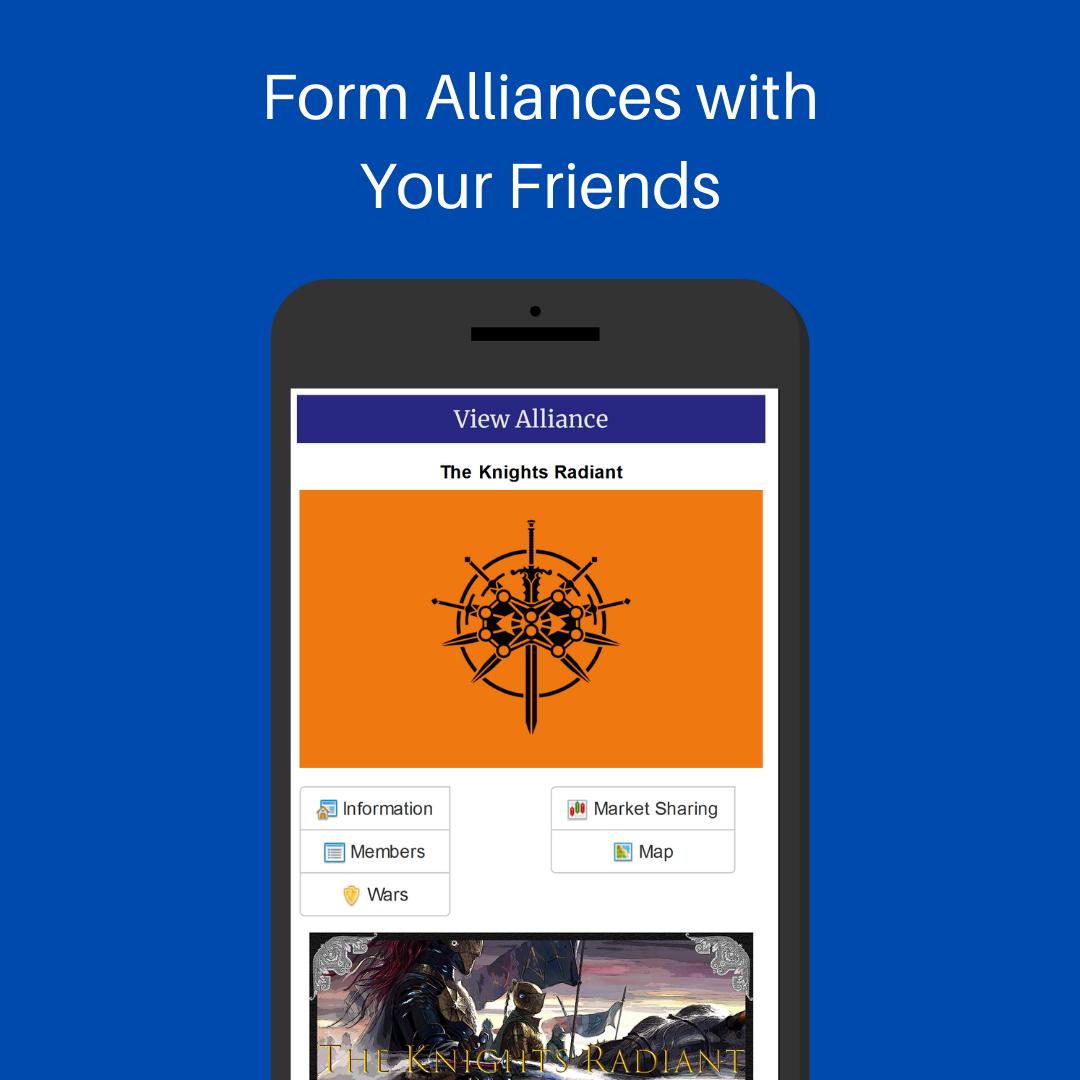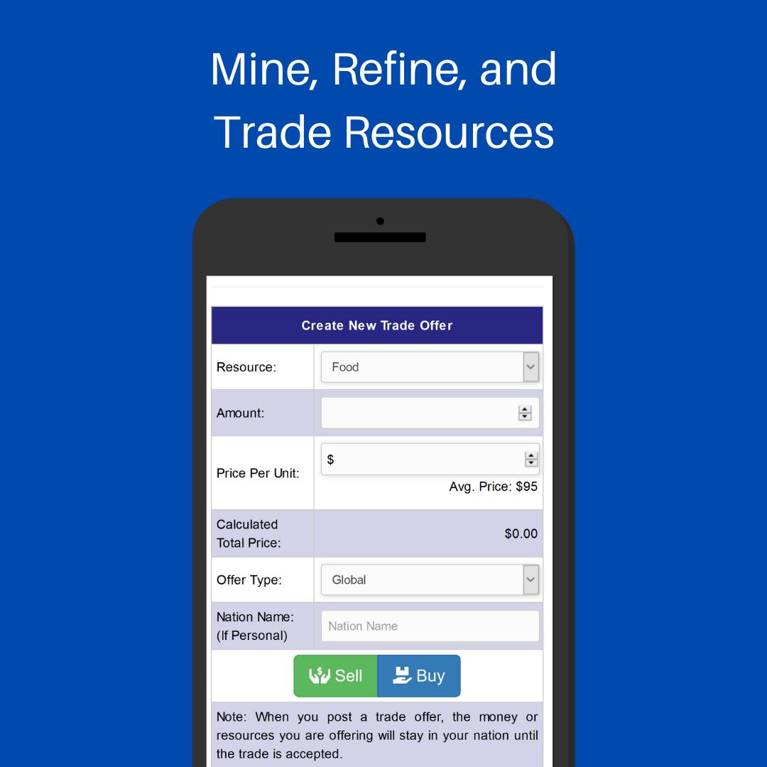 Politics and War is an massively multiplayer online roleplaying game where you create your own country and compete, trade, fight, and politic with thousands of other real players. Forge friendships and treaties, create trade alliances, and wage war with friends, family, and total strangers. Politics and War is free to play and can be played on Android, iOS, and any other device with a web browser. Visit the website at https://politicsandwar.com