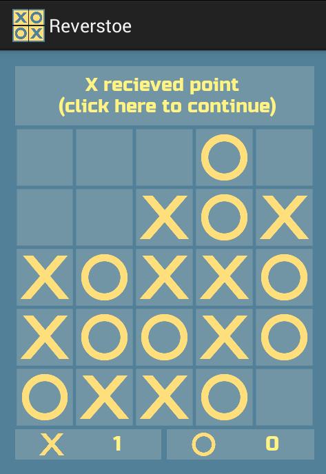 Reverstoe is a game of classic tic-tac-toe but with reversed rules. Everybody knows the classic board game tic-tac-toe, where you win by getting three of your marks in any direction (horizontal, vertical or diagonal). Reverstoe is a game with reversed rules also known as eot-cat-cit, where you are trying not to win, but trapping your opponnent into winning. This rule makes you think in every move, as opposed to classic game where after few moves, you just have to fill the exact spot to prevent opponent from winning.