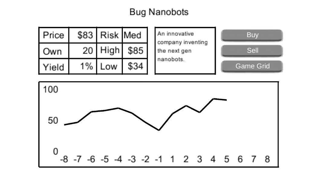 This is a simplified version of the stock market. You start off with $5,000 in Quarter 1. You can invest in 8 different securities, (a fancy name for stocks). Each turn represents one Quarter, or 3 months, in the stock market. Manage your investments correctly and it'll lead to economic success!