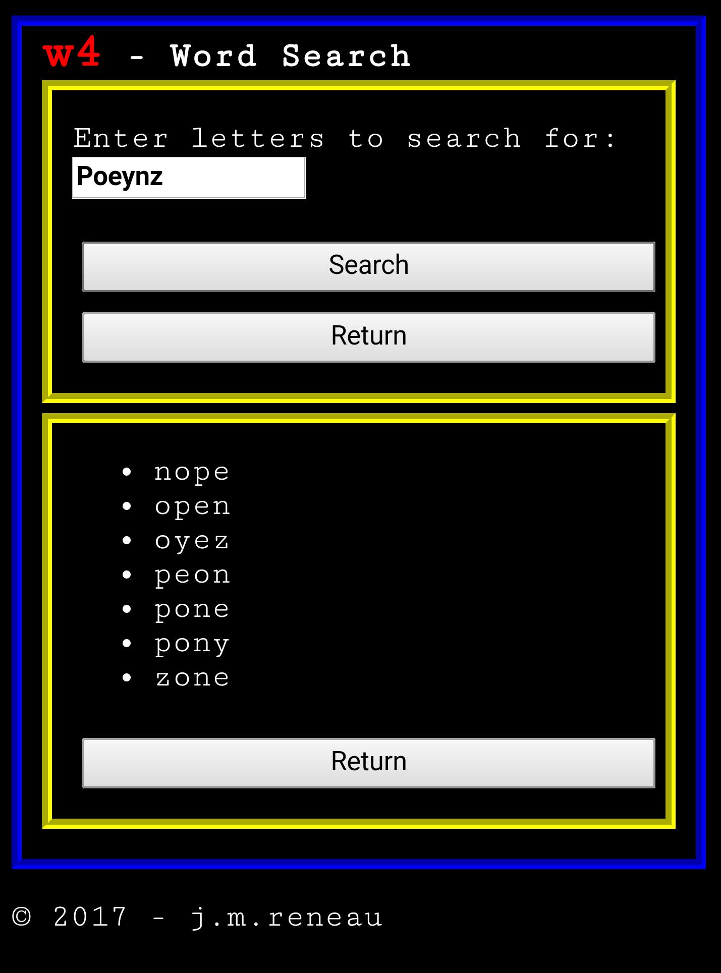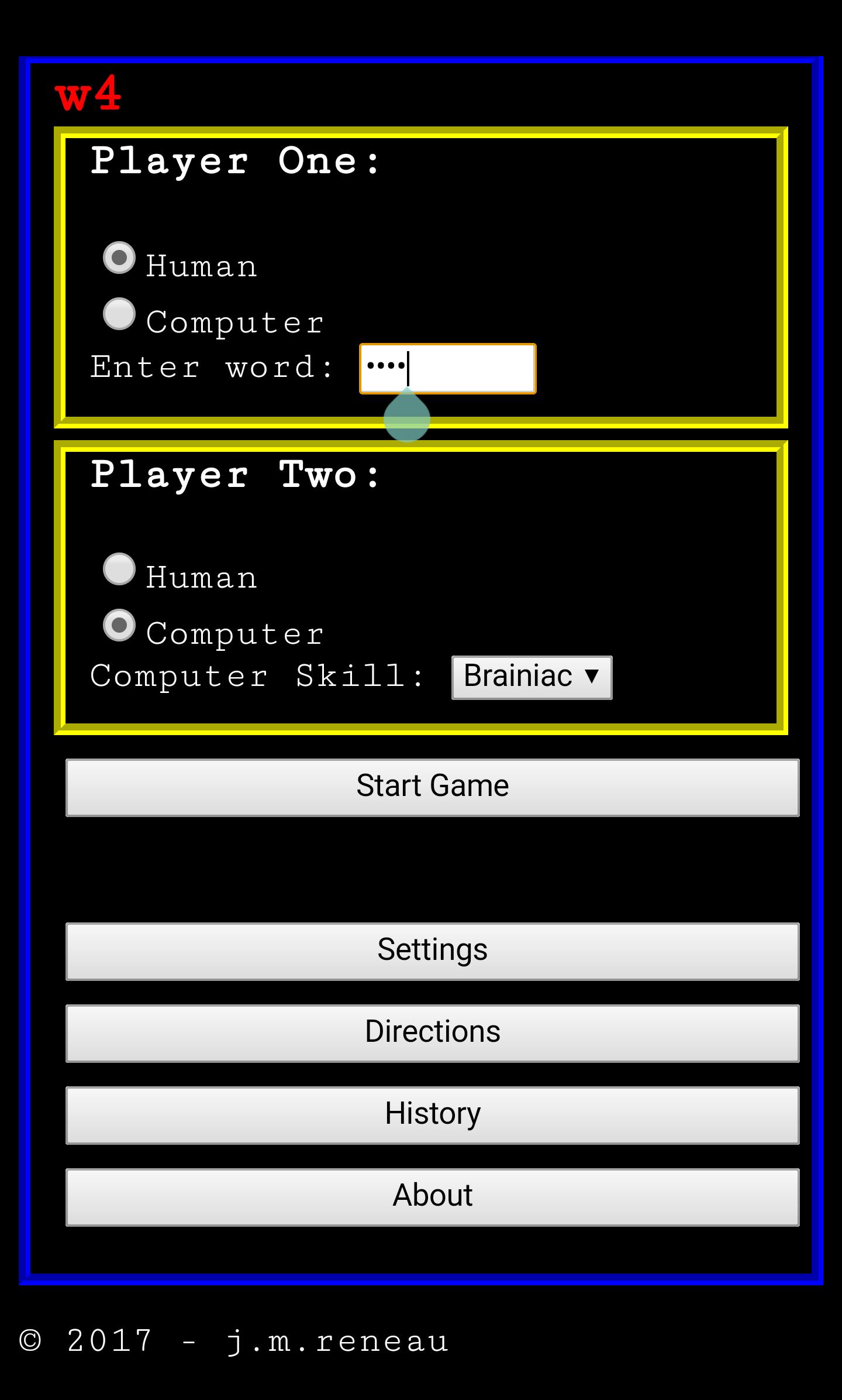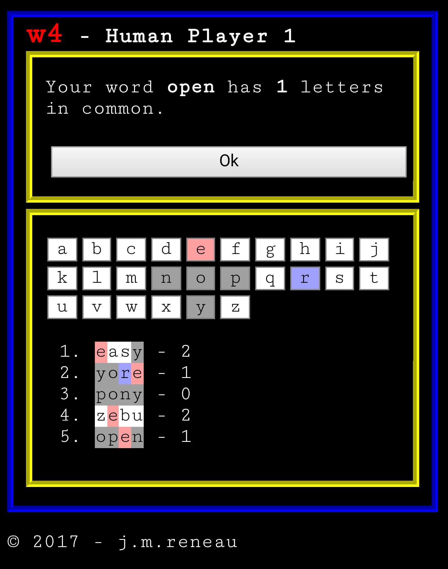 W4 is a word guessing game where each player has a secret 4 letter word and the object is to guess their word, first.