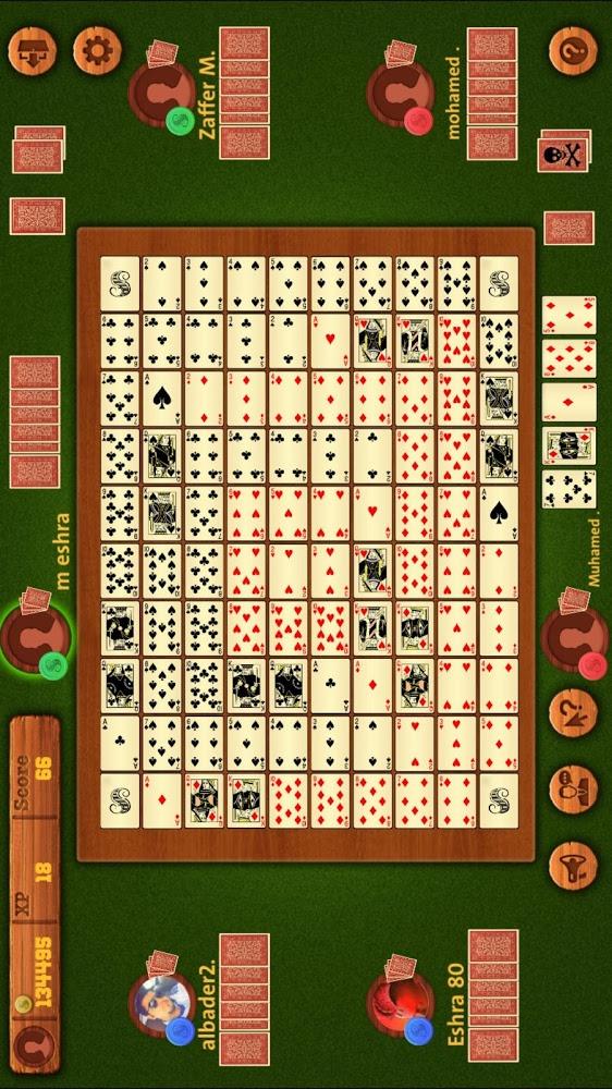 Special spaces. The game board has four special spaces. One in each corner. These spaces are bonus spaces. When using a corner only four additional cards are necessary to complete a sequence. More than one player can use the same corner space. For example: it can be used in both a horizontal sequence for one team and a diagonal sequence for another. هاللعبة خطيييرة وأكشن.. تراوغ، وتخطط صح، عشان تشتت خصمك، وتكسب السيكونسات اللي تفووزك باللعبة. وترا عدد اللاعبين إما يكون فردي أو زوجي، وبحد أقصى ستة. في العدد الفردي : ممكن تلعبون اثنين ضد بعض، أو تلعبون ثلاثة ضد بعض. وفي العدد الزوجي : ممكن تلعبون ثنائي أنت وخويك مقابل اثنين، يعني كلكم أربعة.. وممكن تلعبون ثنائي ثلاث فرق أنت وخويك مقابل فريقين، يعني كلكم ستة.