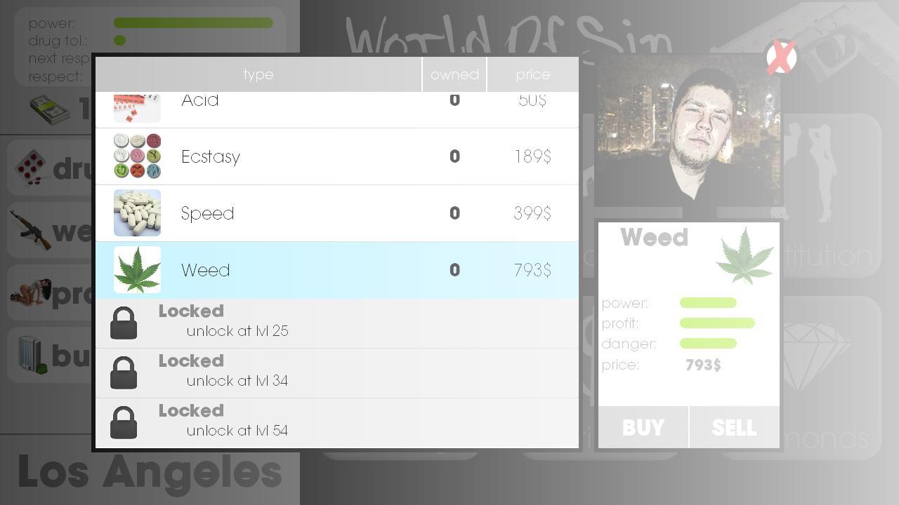 World Os Sin- RPG game. Buy and sell drugs and weapons.