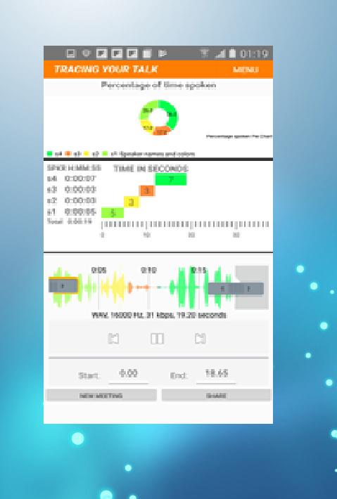 Aplikasi ini menganalisis percakapan secara langsung perangkat Anda untuk mengidentifikasi siapa yang berbicara dan kapan. Ini melakukan ini tanpa upaya Anda dengan menggunakan prinsip -prinsip pembelajaran mesin modern yang diterapkan pada suara yang direkam dari mikrofon Anda. Laporan analisis setelah percakapan memberikan total waktu yang diucapkan setiap orang. Juga, plot piano yang dapat digulir disediakan untuk mengamati dinamika antara pembicara selama percakapan.