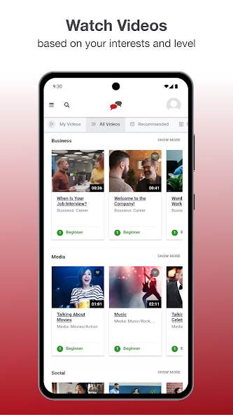 - Tonton video sehari dengan subtitle, direkomendasikan berdasarkan level dan minat Anda.