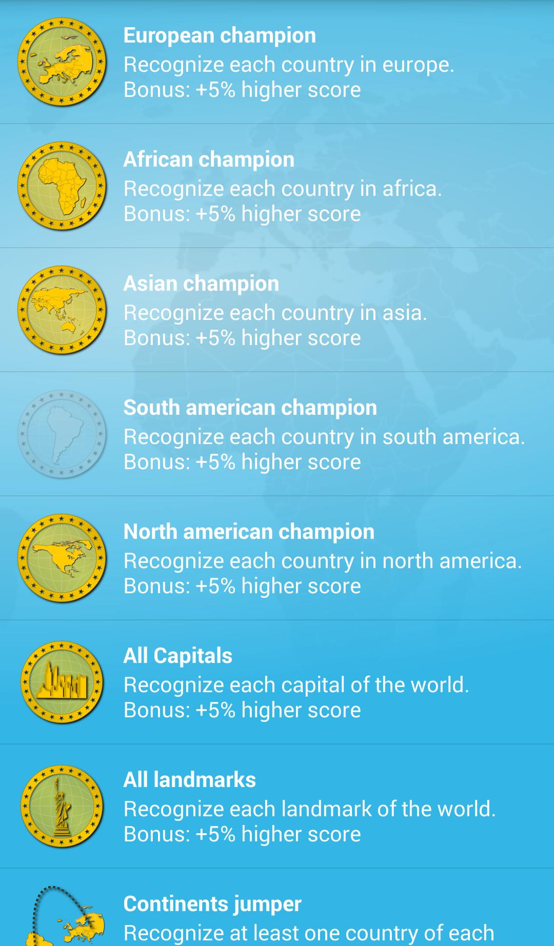 - Untuk membuka kunci fitur premium: akses ke semua negara di seluruh dunia, manajemen highscore, pencapaian, skor multiplikator, 2 jenis jawaban baru (modal dan pemandangan) dengan lebih dari 400 jawaban