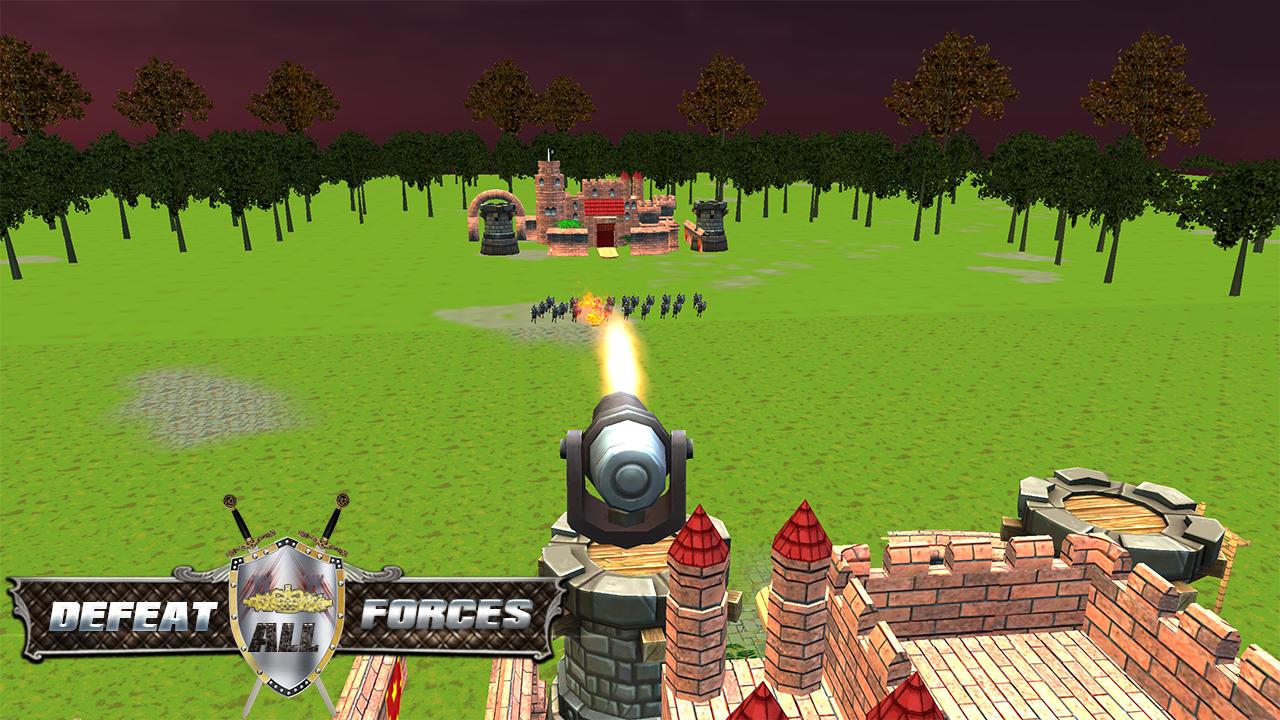 Pilih dari total 3 meriam yang dipasang di 3 menara depan benteng. Dipahami dengan bom ledakan dan bola meriam tembak, pilihlah dengan bijak terhadap musuh mulai dari pemanah, meriam seluler, dan meriam menara musuh.