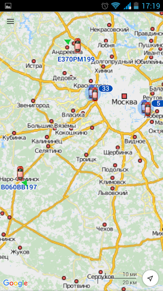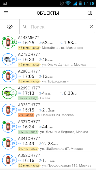 アプリケーションには、監視の各オブジェクトに関するオンライン情報:センサーの位置、速度、最新の値が表示され、フォームトリップと駐車場のオブジェクトの動きの歴史の地図の時系列で、見る機会を与えます。