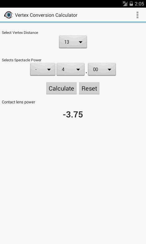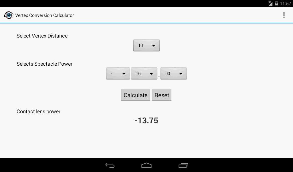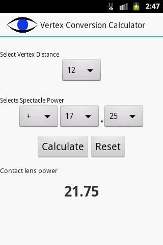 このアプリは、スペクタクル処方のレンズパワーをコンタクトレンズに必要なレンズ電力に変換するために使用されます。検眼医、視神経歴、眼科医、およびコンタクトレンズを着用している人が、変換に必要なパワーを備えたコンタクトレンズを使用することもできます。