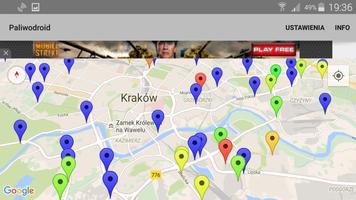 *ステーションの色は、選択した燃料の価格を意味します(緑 - 最も安い、黄色、オレンジから赤 - 最も高価な、青は現在の価格、青色の色なし - ステーションで選択された燃料はありません)