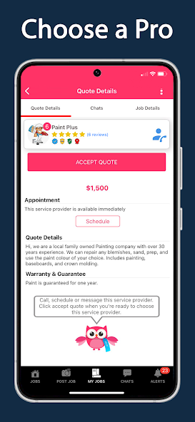 地元のサービスのプロ、請負業者、住宅掃除会社とすぐにQuote Itしてください。すべての修理、メンテナンス、ホーム改善のニーズのための頼りになるアプリ。緊急の修理、小規模な仕事、または大規模な改修であろうと、1つの投稿で無料の競争力のある見積もりを取得します。単に写真を撮り、仕事を投稿してください。地元のホームサービスのプロは、サービス、見積もり、可用性を提供します。塗装、配管、電気、家の清掃、総合的な契約から、60を超えるホームサービスカテゴリのすべてのホーム改善プロジェクトの専門家を見つけます。