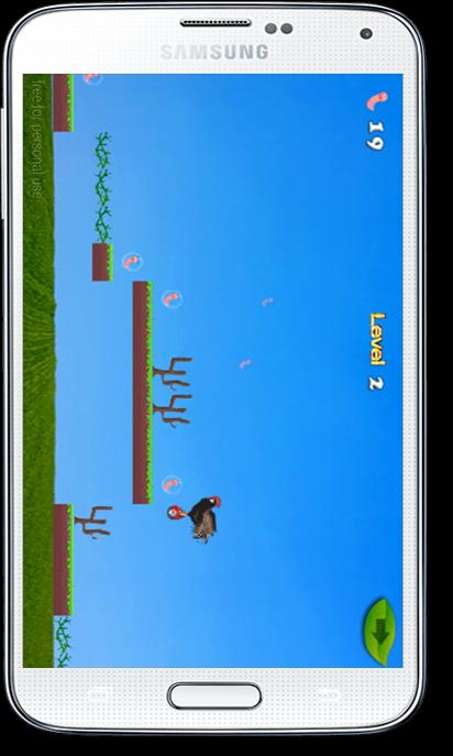 冒険家の鶏肉のためにタブレットまたはスマートフォンのスクリーンをタップして、鶏肉の道の障害物をavoideするためにジャンプします。