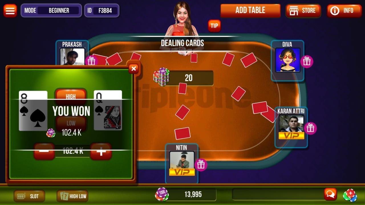Triple One Teenpattiは、3枚のカードで演奏されたポーカーブラッグのインド版で、インドのポーカーカードゲームに参加して、1つのゲームでTeen Patti KingまたはBeggarに参加してください。