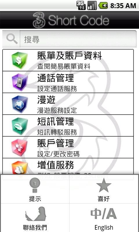 이 응용 프로그램을 사용하면 Call Forward, SMS Forward, Roaming, Check Bill 등을 포함한 모든 3HK 단락 코드를 검색하고 활용하는 데 도움이됩니다.