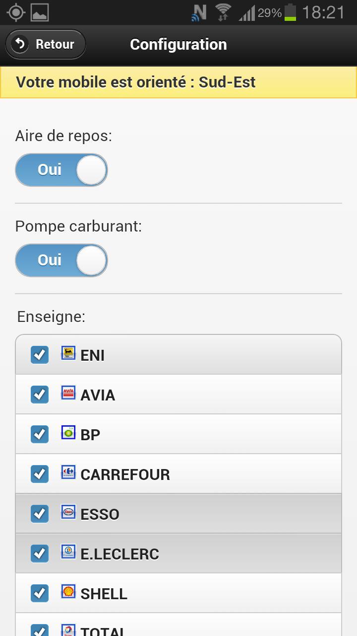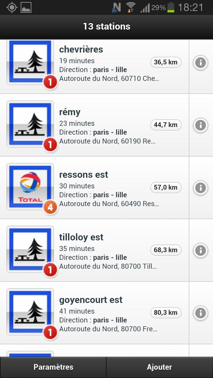 한눈에, 당신은 다음 주유소와 휴식 공간에서 당신을 분리시키는 킬로미터의 수를 알 수 있습니다. 각 가솔린 스테이션에 대해 브랜드는 선호도에 따라 소모품을 계획 할 수 있도록 명확하게 표시됩니다.