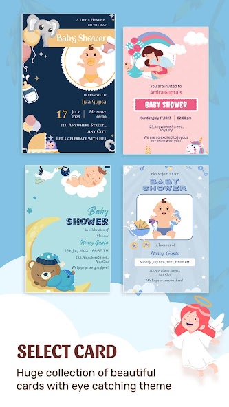 카드 선택부터 시작하여 베이비 이름, 날짜, 시간 및 장소와 같은 베이비 샤워에 대한 정보를 추가하십시오. 이 응용 프로그램을 사용하면 즉시 베이비 샤워 카드를 만들 수 있습니다.