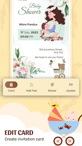 베이비 샤워 파티를 위해 가까운 사람과 사랑하는 사람들을 초대하는 미래의 부모와 조부모에게 엄청난 기쁨입니다. 특별히 설계된 Baby Shower Invitation Card 제조업체 앱은 빌드 내 템플릿, 이미지, 스티커 등으로 흥미 진진합니다.