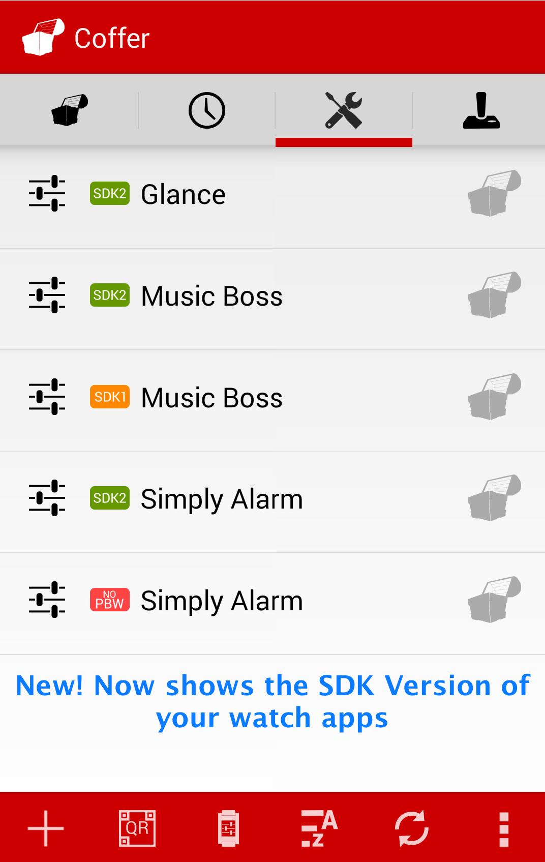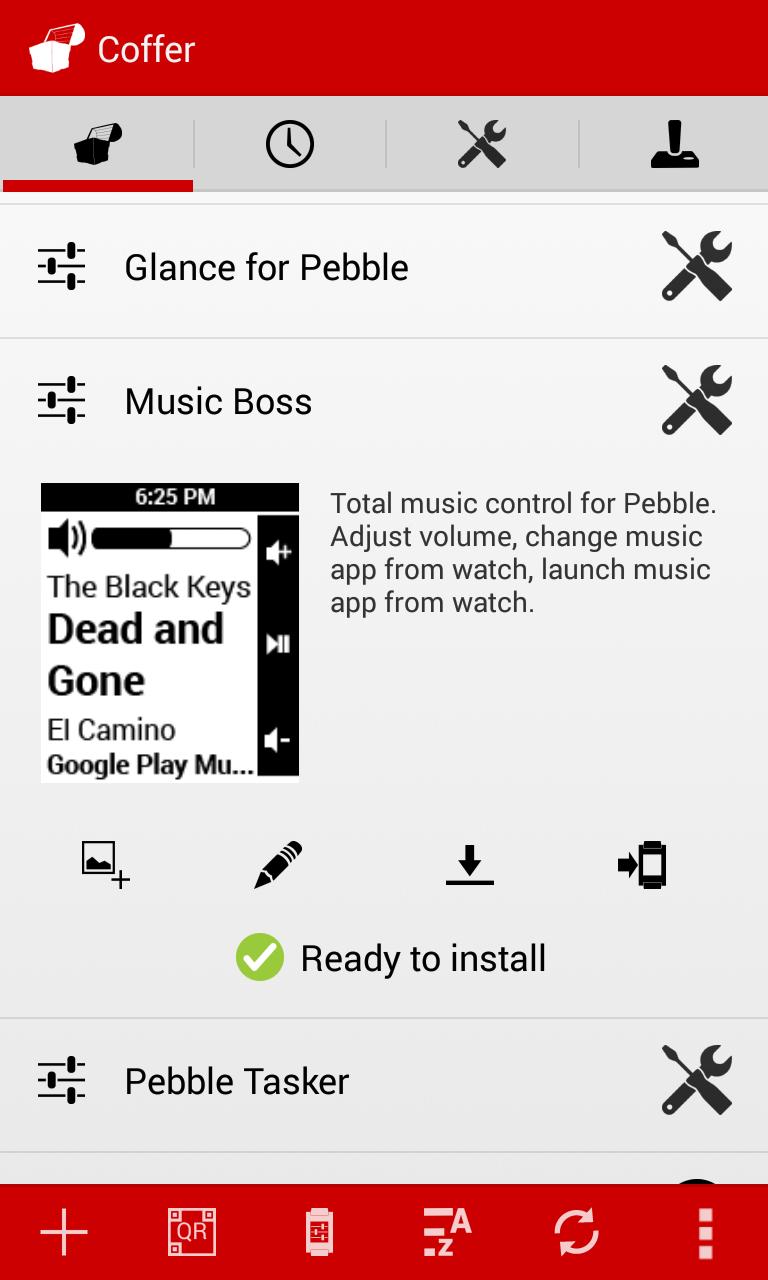 장치의 웹을 탐색하고 앱을 클릭하여 앱 QR 코드를 스캔하거나 수동으로 웹 URL을 입력하여 Android 기기에 이미 저장된 Pebble Watch 앱으로 Coffer 빠르게 채울 수 있습니다. 앱의 모습을 정확히 상기시키기 위해 사진을 추가 할 수도 있습니다! 시계 앱을 선택하자마자 앱의 이름과 요약이 자동으로 Coffer 로 채워집니다!