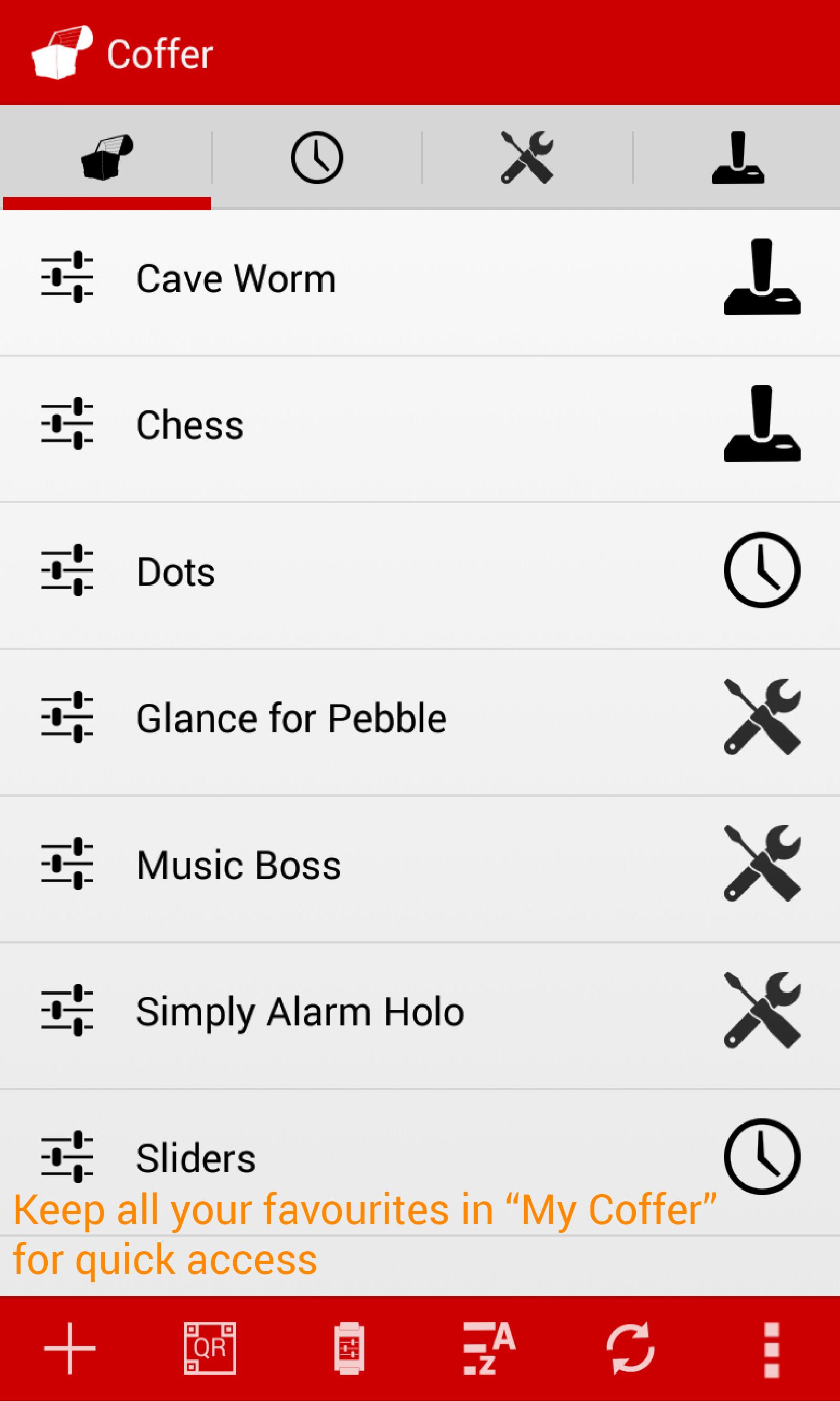 Coffer 좋아하는 시계 얼굴, 앱 및 게임을 추적하고 보관할 수있는 다목적이고 직관적 인 방법을 제공합니다. 좋아하는 시계 앱을 찾아 복원하기 위해 항상 웹 사이트를 탐색하는 대신 Coffer 에 저장하고 한 번의 클릭으로 Pebble에 직접 설치하십시오.