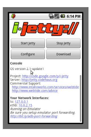 i-jetty Android 모바일 플랫폼 용 인기있는 Jetty Open-Source 웹 컨테이너의 포트입니다. 접점, 이미지 및 음악과 같이 모든 데스크탑 브라우저에 대한 온 폰 컨텐츠를 제공하는 예제 웹 응용 프로그램이 포함되어 있습니다. 이름은 "I, Robot"의 말장난입니다.