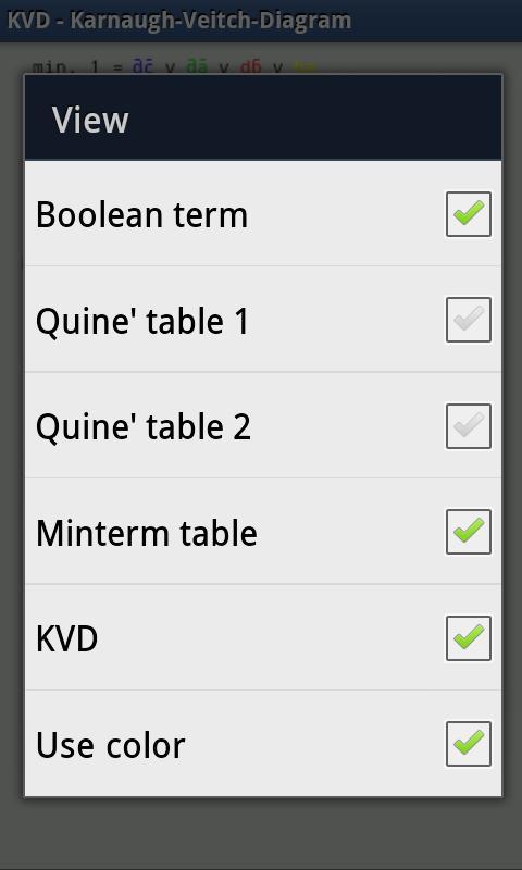 이 소프트웨어는 Karnaugh-Veitch-Diagram의 2 개까지 5 개의 변수에서 부울 표현식을 시각화하고 Quine-McCluskey 알고리즘에 의한 최소 표현을 계산하기 위해 작성되었습니다.