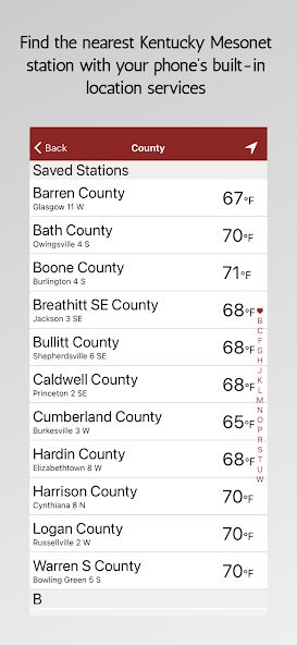 • 휴대 전화의 내장 위치 서비스를 사용하여 가장 가까운 Kentuc KY Mesonet 스테이션을 결정하거나 기본 스테이션을 선택하십시오.