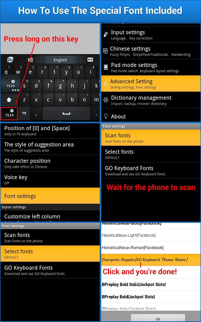 --- 사용자 정의 글꼴을 사용하려면 Press Long '이 포함되어 있습니까? 123 '키,'고급 설정 '으로 이동하고'글꼴 설정 '을 선택한 다음'스캔 글꼴 '을 선택하고 Leather Keyboard 있는 글꼴을 선택하십시오. 자세한 내용은 마지막 스크린 샷/프레젠테이션 비디오를 참조하십시오.