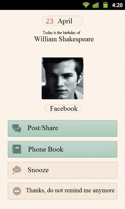 이제 당신은 친구의 생일을 결코 잊지 않을 것입니다! 유료 버전은 소셜 네트워크를 모두 사용하고 광고를 싫어하는 사람들을위한 것입니다. 또한 벽에 사진을 게시 할 수 있습니다. 주저하지 말고 의견을 남겨주세요. 신청서 작업에 관한 질문이 있으시면 이메일을 보내 주시기 바랍니다. 여기 에서이 응용 프로그램이 어떻게 생성되었는지 http://touchcool.blogspot.com/을 읽을 수 있습니다.