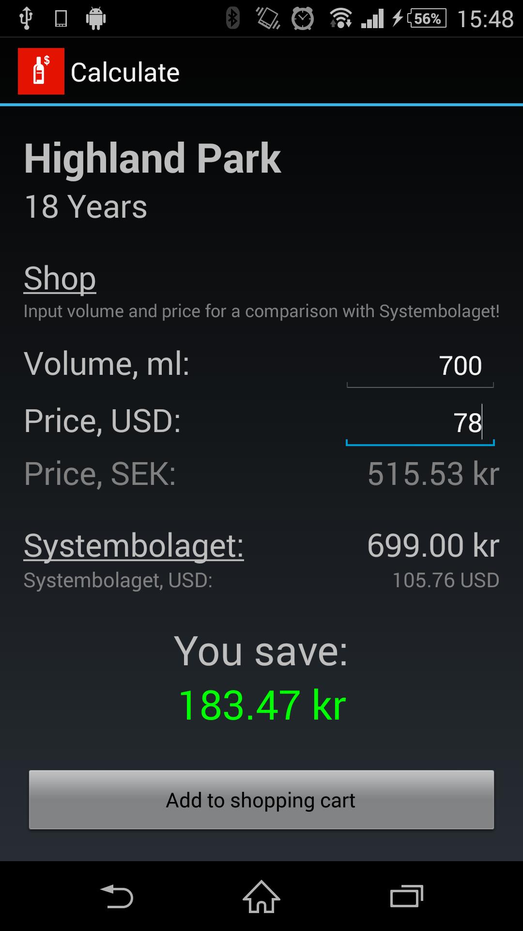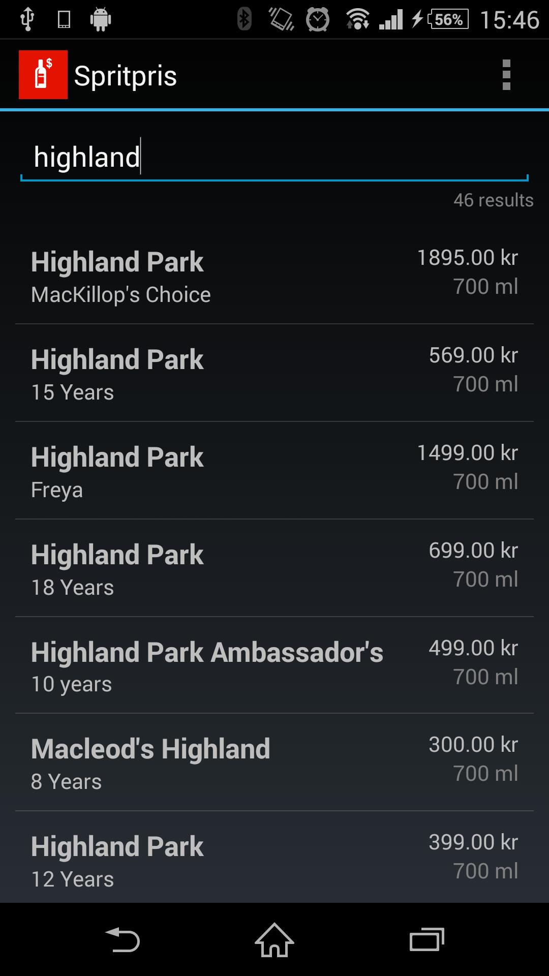 SystemBolaget (스웨덴 주 독점 주류 상점)의 데이터베이스를 검색하십시오. 가격을보고 외화와 비교하고 자신만의 쇼핑 카트를 만듭니다. 면세 상점에서 가격 비교에 적합합니다. 검색은 로컬로 저장된 데이터베이스 사본에 대해 수행되므로 인터넷 연결이 필요하지 않습니다.