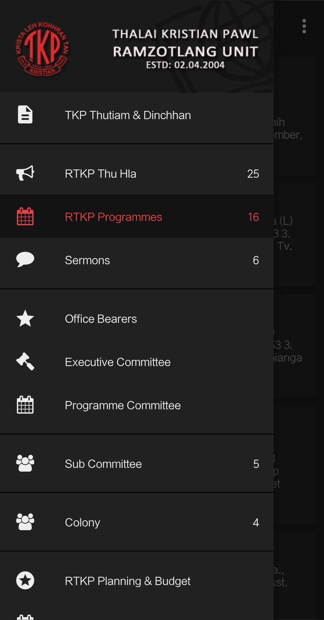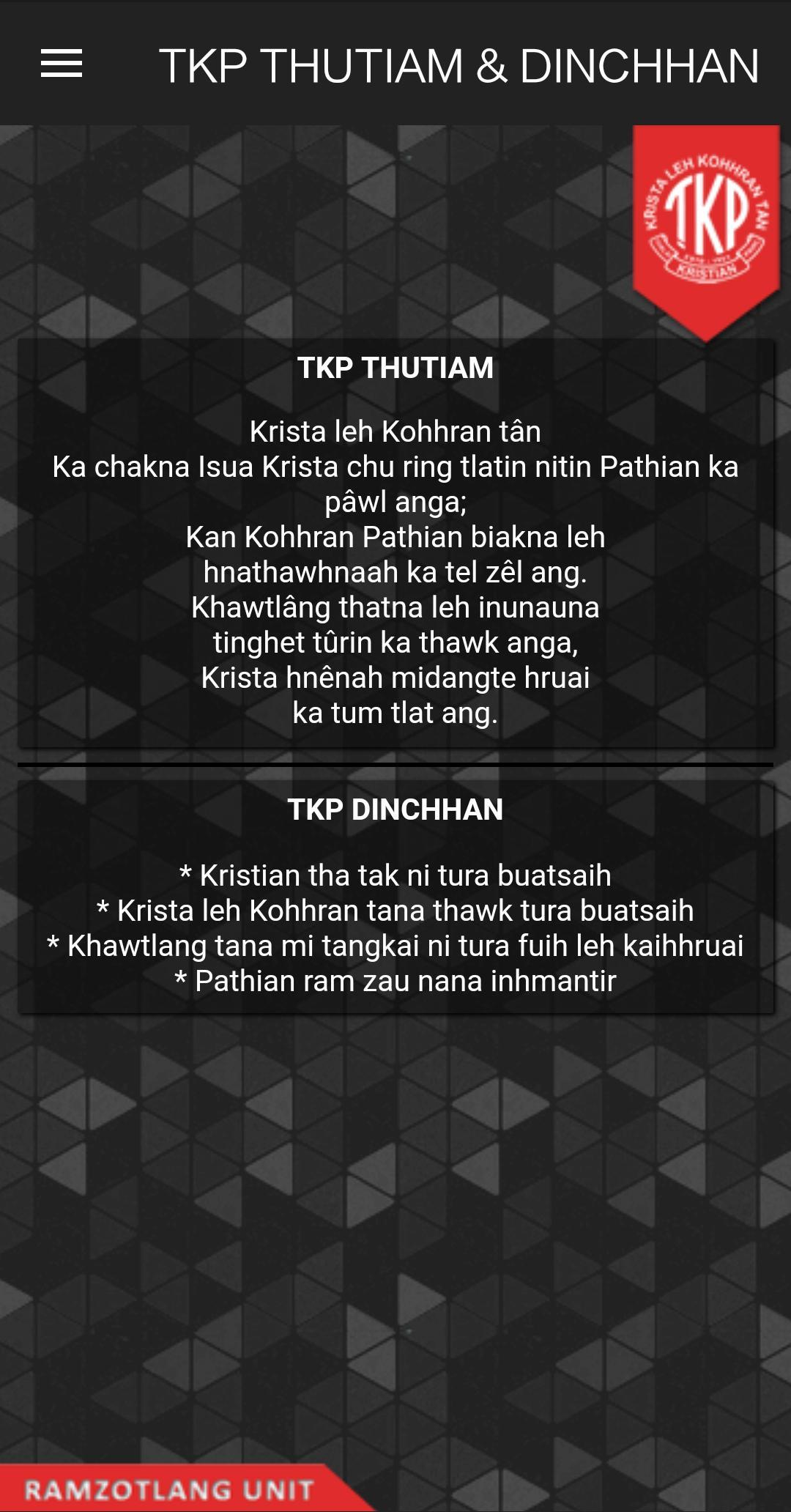 RTKP Android 앱은 Thalai Kristian Pawl Ramzotlang Unit의 모든 구성원을 위해 'Thalai Kristian Pawl Ramzotlang Unit Information Sub Committee'에 의해 개발되어 각 회원이 RTKP 계획 및 예산, 단위 매뉴얼 및 친교 조직 규칙 및 표준을 더 잘 이해할 수 있도록했습니다. 또한 부대 사무실 소지자, 집행위원회, 프로그램위원회, 소위원회 및 식민지 세부 사항에 대한 모든 세부 사항도 제시됩니다. Petros, Unit TKP 및 BCM 뉴스가 출판 한 주간 신문 인 Petros는 쉽게 액세스하고 읽을 수 있도록 정기적으로 업데이트됩니다.
