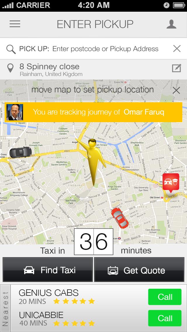 > 픽업 할 때 라이브 맵에서 택시를 추적하십시오.