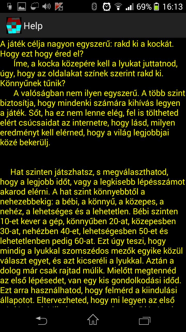 사용 가능한 6 개의 레벨이 있으며, 가장 짧은 시간 또는 가장 적은 수의 단계를 목표로 설정할 수 있습니다. 6 단계는 다음과 같습니다.“베이비”,“쉬운”,“중간”,“하드”,“가능한”및“불가능”. "베이비"레벨에서 큐브는 10 번 스크램블되며,이 숫자는 각 레벨마다 증가합니다 ( "쉬운"레벨에서 20 회, "중간"레벨에서 30, "하드"레벨에서 40, "가능한"레벨은 50, "불가능한"레벨에서 60). 이 프로그램은 "구멍"(누락 된 부품)에 인접한 부분을 선택하고 장소를 교환하여 큐브를 긁습니다. 나머지는 당신에게 달려 있습니다. 첫 단계 전에, 당신은 당신의 마음을 구성하고 초기 상황을 평가할 시간이 조금 있습니다. 처음 몇 단계를 계획 할 수 있습니다. 처음 몇 단계 후에만 스텝 카운터와 타이머가 시작됩니다. 스텝 카운터와 타이머가 각 모드에서 시작됩니다. 드로우의 경우, '스텝 모드 "에서 시간에 따라 순위 위치가 결정되고 그 반대도 마찬가지입니다. 필요한 시간이 다른 사람의 시간과 밀리 초에 일치하면 단계 수는 결정됩니다. 절대적인 드로우의 경우 결과를 올리는 플레이어는 먼저 우위를 차지합니다. 소셜 미디어 사이트에서 결과를 공유 할 수 있습니다.