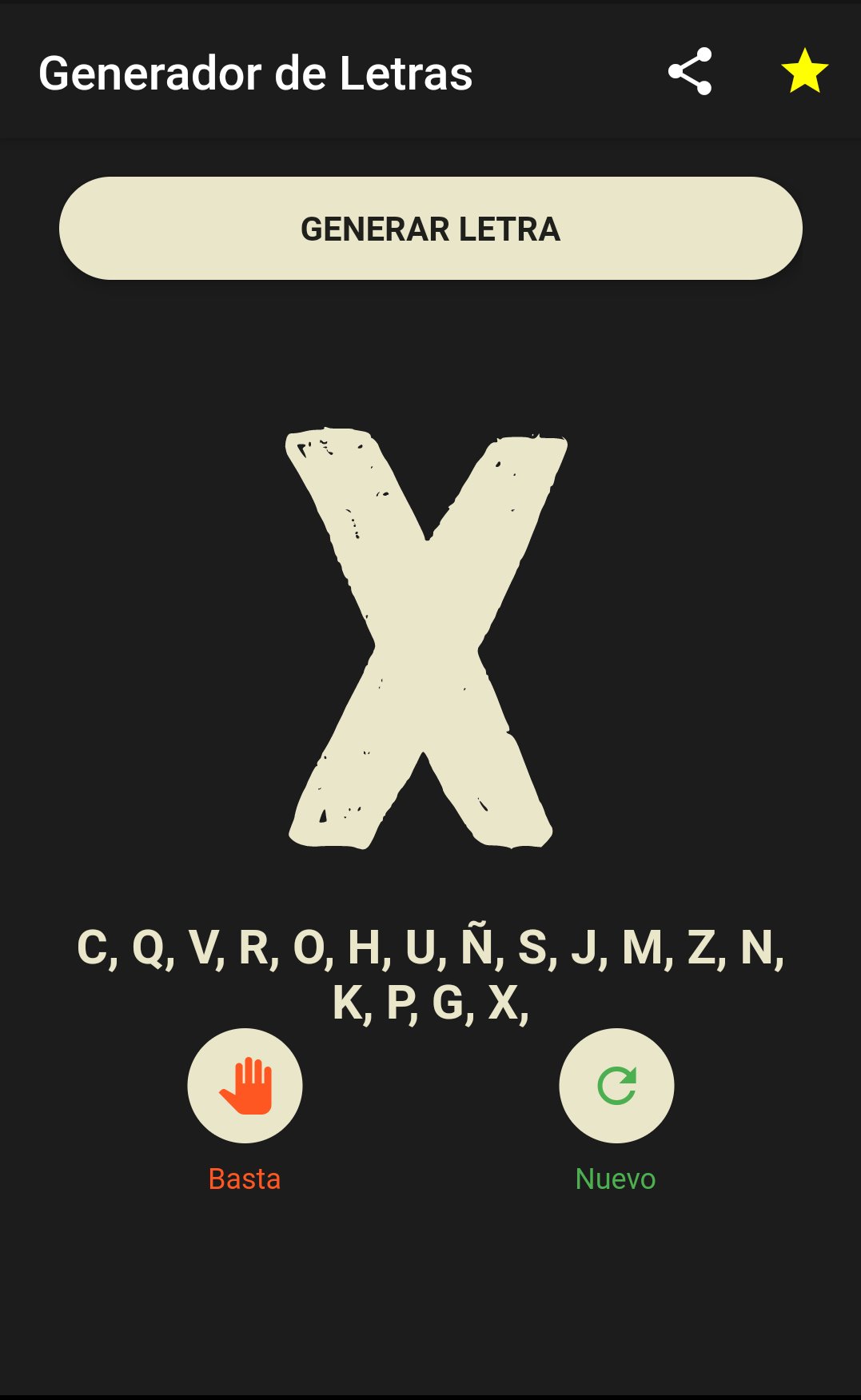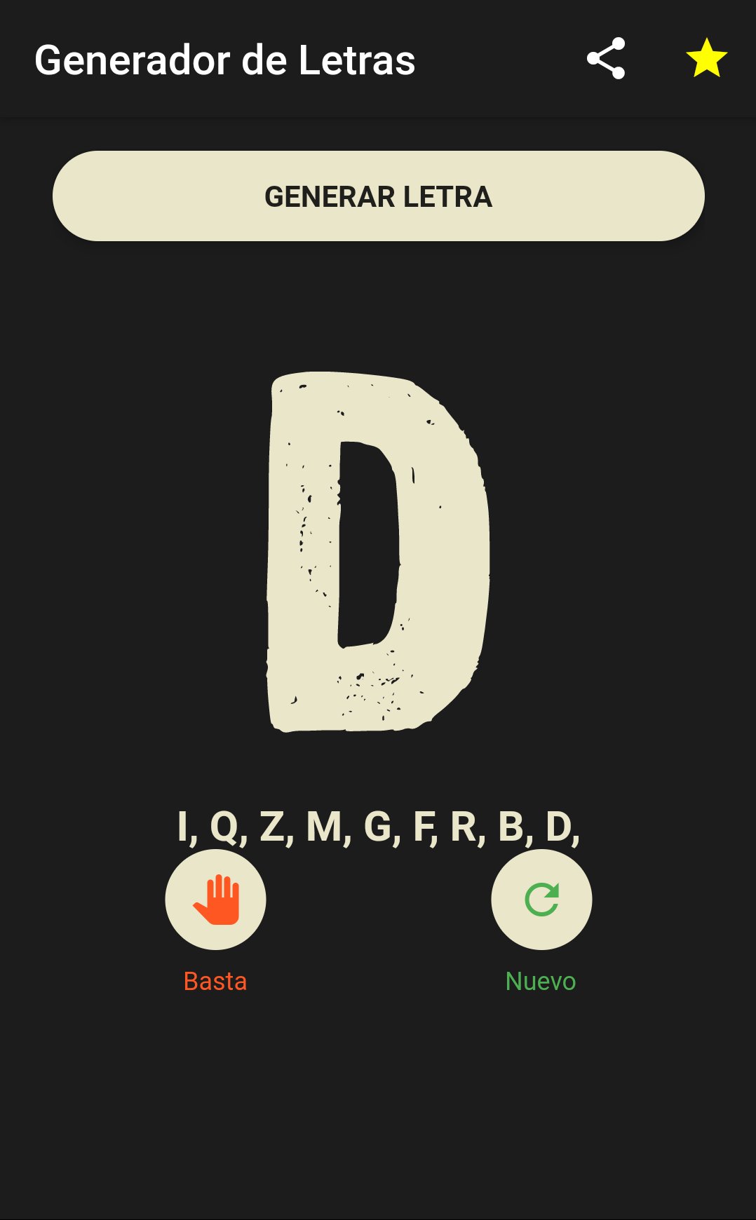 이 응용 프로그램은 전통적인 Basta 게임에 사용되는 알파벳 LETTERS 생성을 지원합니다.