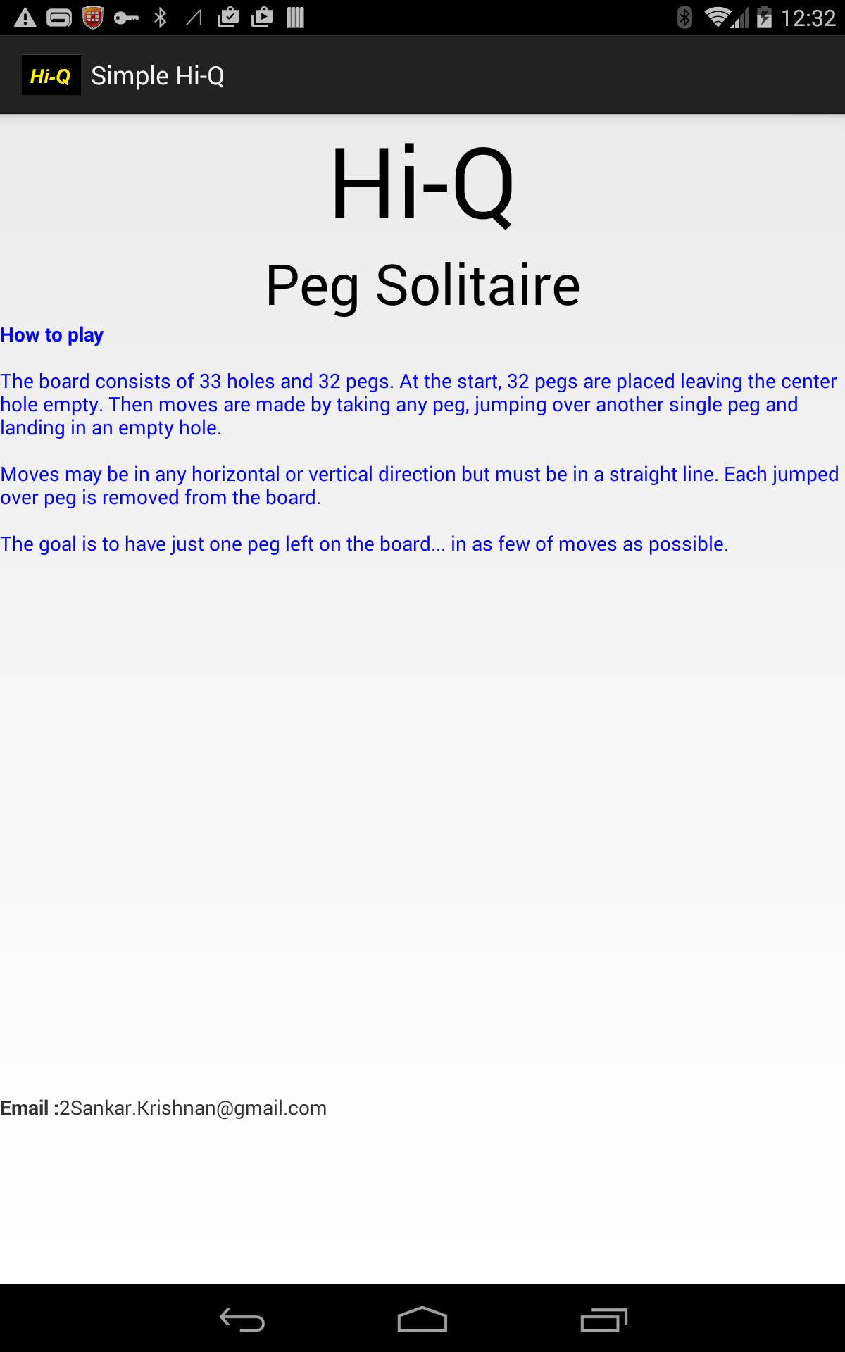 Hi-Q 구멍이있는 보드에 페그의 움직임을 포함하는 한 명의 플레이어를위한 PEG Solitaire 게임의 한 유형입니다. 보드는 33 개의 구멍과 32 개의 페그로 구성됩니다. 처음에는 32 개의 페그가 중앙 구멍을 비워두고 배치됩니다. 그런 다음 페그를 가져 와서 다른 단일 페그 위로 점프하고 빈 구멍에 착륙하여 움직임이 이루어집니다.