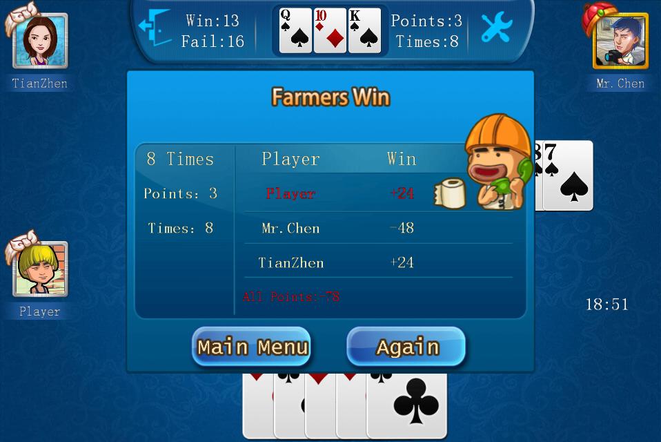 집주인은 카드가 남지 않으면 승리합니다. 농민 팀은 농민 중 한 사람에게 카드가 남지 않으면 승리합니다.
