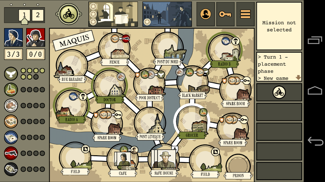 Maquis 는 다양한 목표를 가진 Solitaire Worker 배치 게임입니다. 플레이어는 자신의 저항 요원을 마을 주변의 공간에 배치하여 목표를 달성합니다 (열차를 날려 버리고 지하 신문 출판, 스파이를 지원하는 등). 동시에 공동 작업자와 군인 들이이 지역을 순찰합니다. 하루가 끝날 때 안전한 집으로 돌아갈 수없는 요원은 체포되어 다시는 보지 못했습니다.