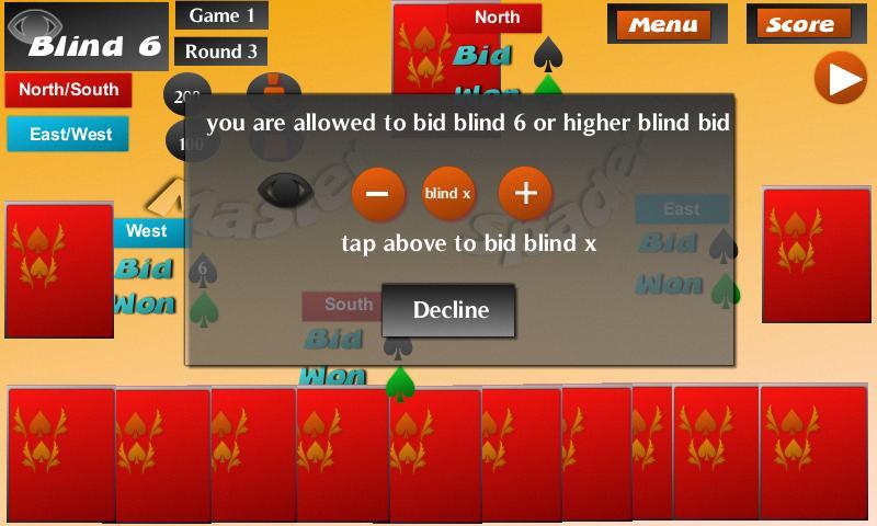당신의 nil, blind nil을 덮을 지능형 컴퓨터 파트너와 함께 노는 것을 즐기십시오. 또한 NT BID, BEMO BID 및 MOON & BOSTON, BLIND 6 등을 지원합니다.