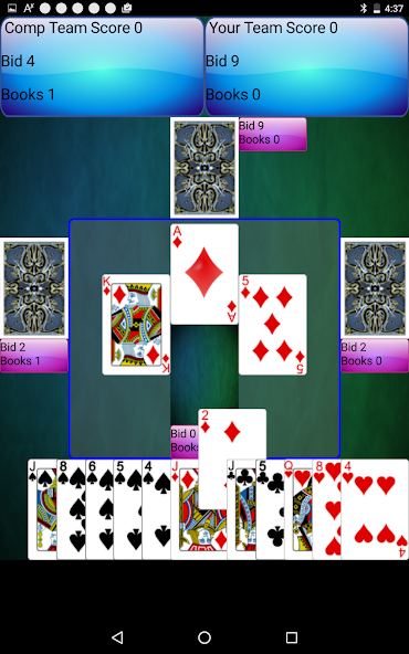 Spades - County Rules 은 스페이드 카드 게임의 변형으로 입찰 (가방), 블라인드, 비 입찰 및 서적에 대한 포인트가 없습니다. 또한 팀 게임입니다. 컴퓨터 팀에 대한 팀. 나중에 컷 목을 옵션으로 추가하겠습니다. 카운티 규칙에 대한 입찰에 중점을두고, 입찰을하고 포인트를 얻거나 그렇지 않습니다. 최소 입찰가는 4이고 최대 값은 10입니다. 10을 만들기위한 추가 포인트를 얻지 못하지만 상대방이 설정되므로 훨씬 더 나은 곳에 있습니다. 첫 번째 팀은 25 승을 거두었습니다.