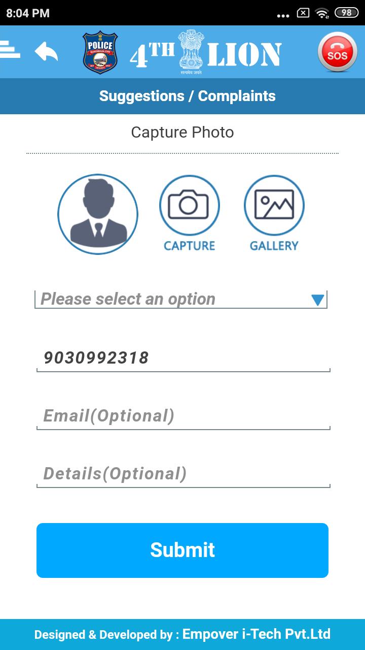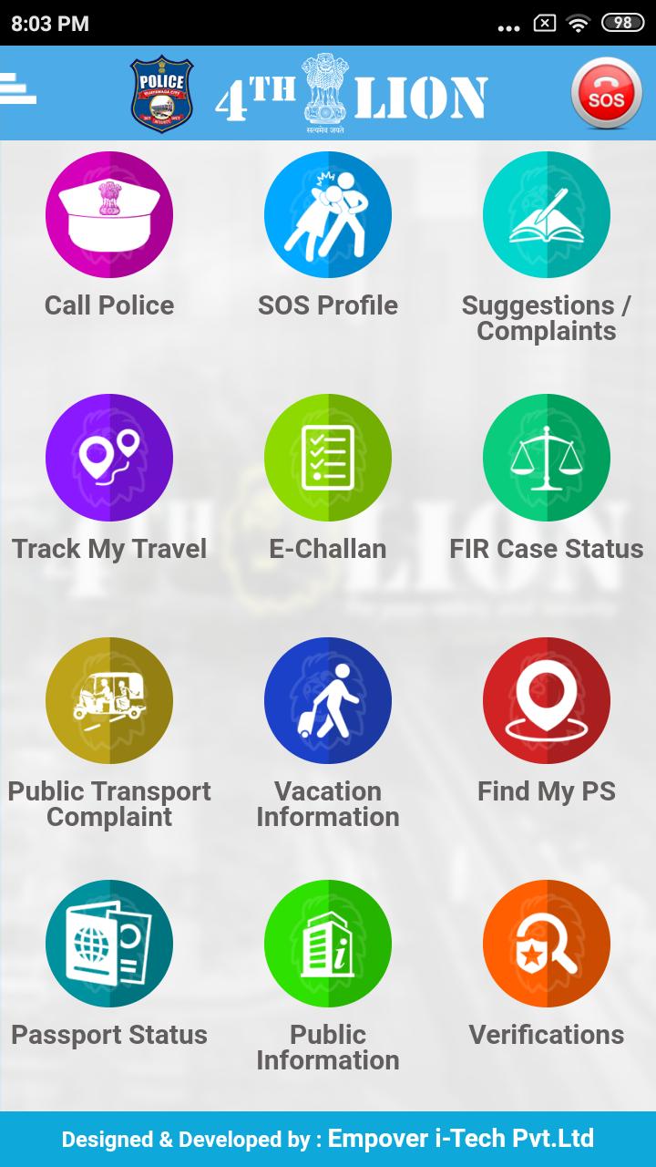 O aplicativo móvel 4th Lion (Vijayawada Police Citizen Services) permite que os cidadãos da jurisdição da polícia de Vijayawada recebam vários serviços de segurança, segurança e serviços públicos. Você pode aproveitar vários serviços policiais através do telefone celular. Permite a polícia inteligente - interações cidadãos. A polícia de Vijayawada escolheu Empover I-Tech Pvt. Ltd, Hyderabad, como parceiro de TI para automatizar esses serviços. Os esforços para improvisar e adicionar novos serviços continuarão.