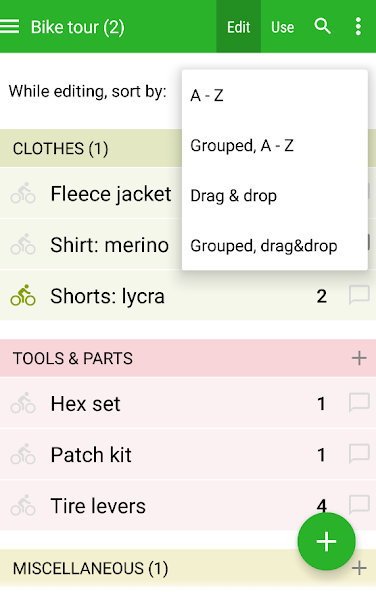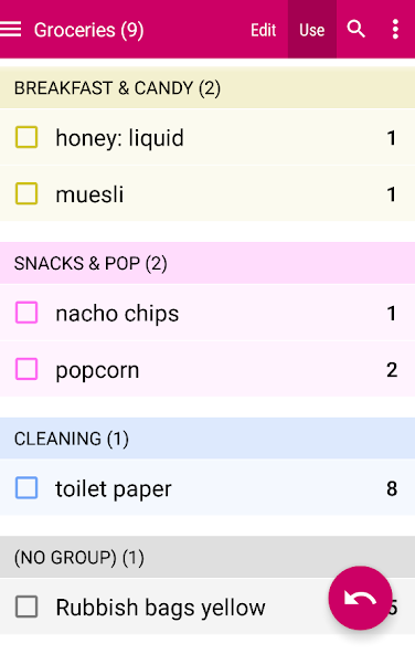 No supermercado, toque em "Use" para mostrar apenas os itens marcados, agrupados pelos corredores que você configurou. Chega de rolar para cima e para baixo uma longa lista - é classificado para corresponder à ordem dos corredores da sua loja.