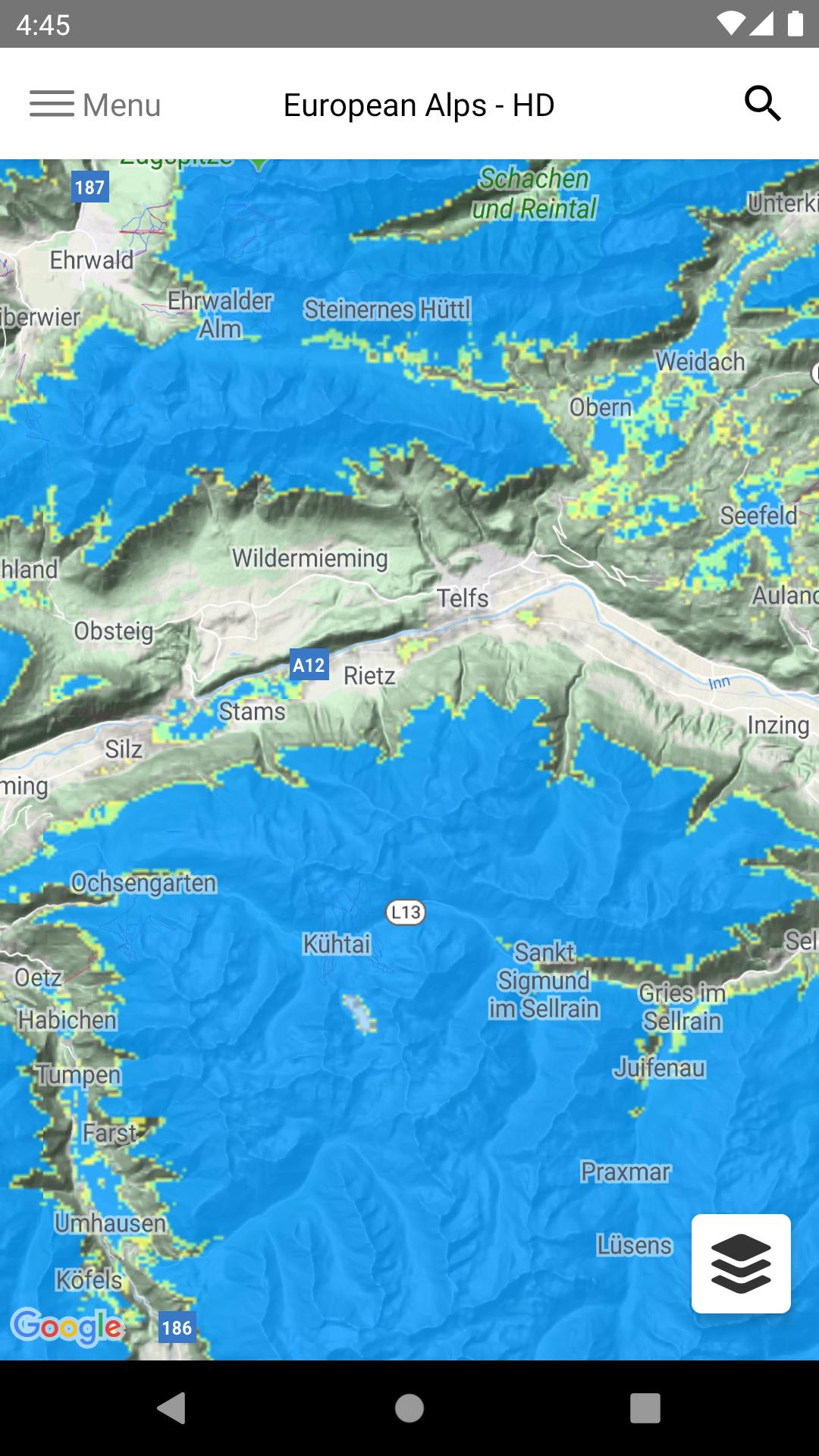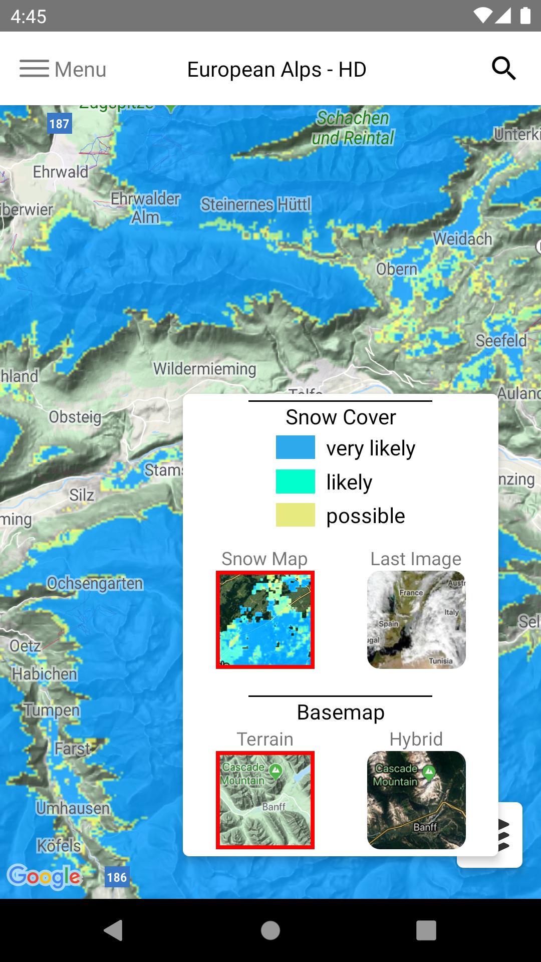 O aplicativo fornece probabilidades de cobertura de neve recentes e sem costura com base nos dados de satélite da NASA e da ESA.